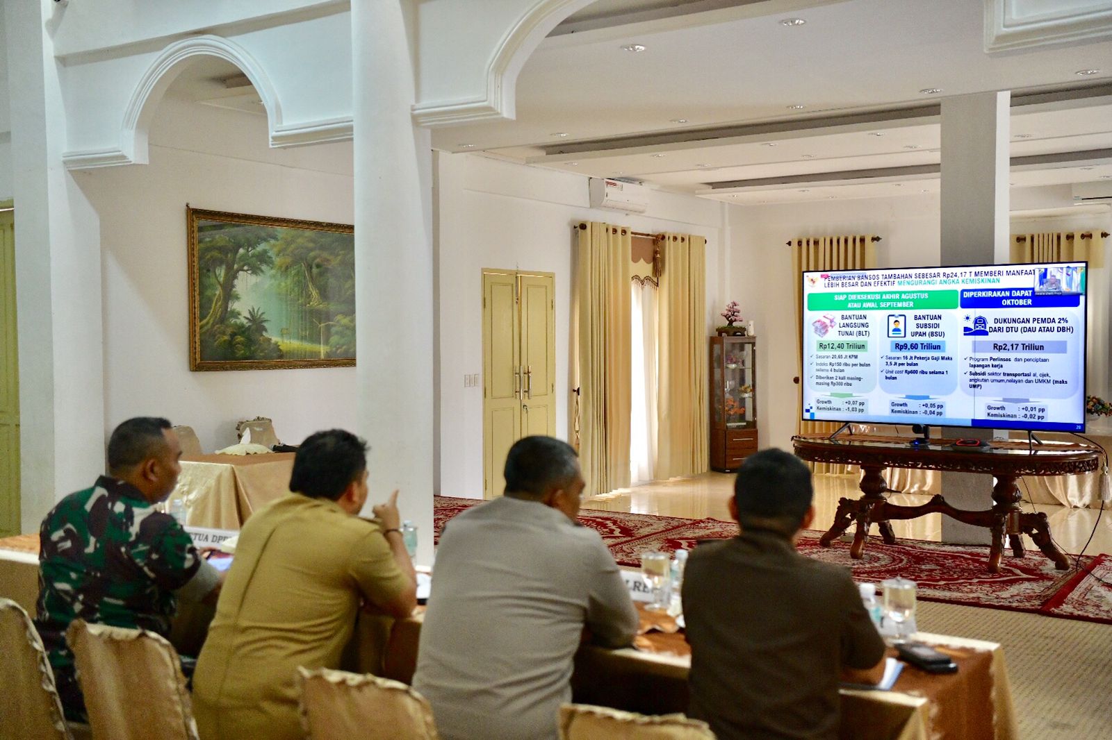 KOTA JANTHO — Pj Bupati Aceh Besar Muhammad Iswanto mengikuti Rapat Koordinasi (Rakor) Pengendalian Inflasi Daerah yang yang dipimpin Menteri Dalam Negeri Muhammad Tito Karnavian secara virtual, Senin (5/9/2022).