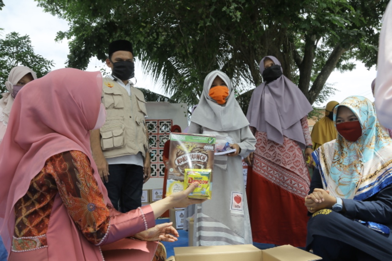Aceh Besar – Wakil Ketua PKK Aceh, Dyah Erti Idawati, menyalurkan Kids Meal dari Global Ehsan Relief Indonesia kepada Cahaya Aceh Foundation, sebuah yayasan sosial dan kependidikan di Gampong Lambada Lhok Kecamatan Baitussalam Aceh Besar, Rabu 6/5.