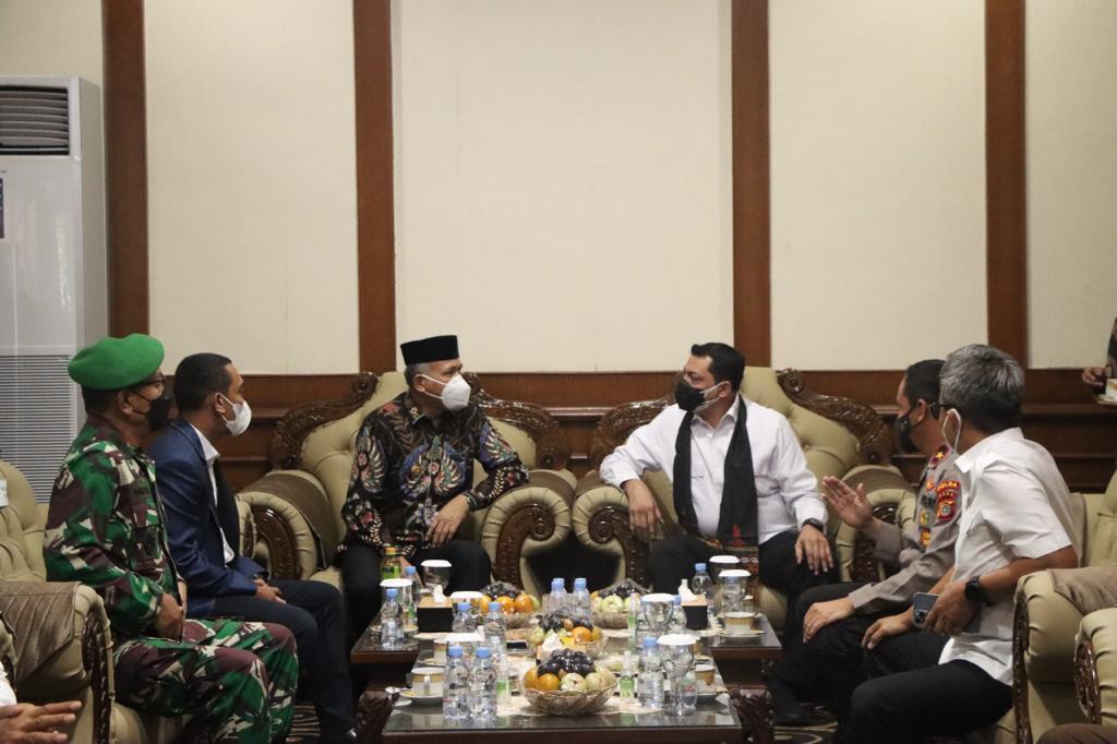 JANTHO – Gubernur Aceh Nova Iriansyah, bersama unsur Forkopimda Aceh, menyambut kedatangan Kapolda Aceh yang baru, Irjen Pol Ahmad Haydar, di ruang VIP Bandara Internasional Sultan Iskandar Muda (SIM) Blang Bintang, Kamis (12/8/2021).