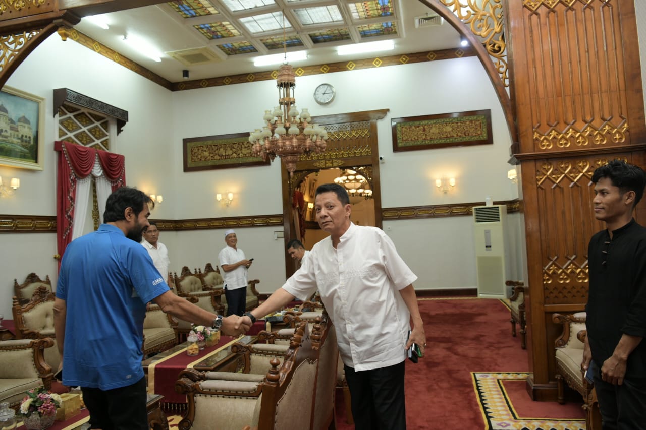 BANDA ACEH – Pj Gubernur Aceh Achmad Marzuki didampingi Kadispora Aceh Dedi Yuswadi menerima kunjungan Ketua Umum KONI Aceh Muzakir Manaf beserta rombongan di Pendopo Gubernur Aceh, Jumat (9/12). Pertemuan itu digelar untuk membahas pembukaan Pekan Olahraga Aceh (PORA) Pidie pada Sabtu (10/12) besok.