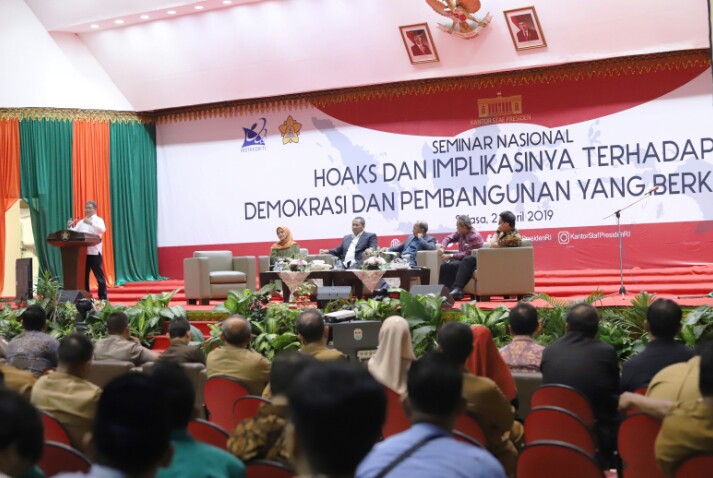 Hal ini disampaikannya di hadapan ratusan mahasiswa Unsyiah dalam seminar nasional bertema ‘Hoaks dan Implikasinya terhadap  Demokrasi dan Pembangunan yang Berkelanjutan”. Kegiatan yang berlangsung di Gedung AAC Dayan Dawood, Darussalam, Banda Aceh, Selasa (2/4) ini dilaksanakan oleh Kantor Staf Kepresidenan, Kominfo, dan Universitas Syiah Kuala.