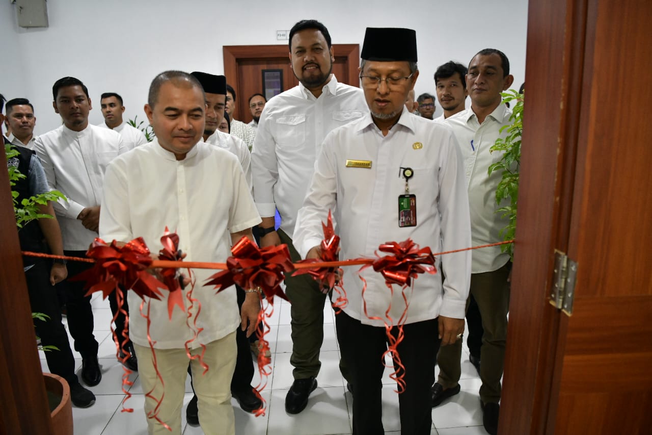 Asisten Administrasi Umum Sekda Aceh, Dr. H. Iskandar, AP, S.Sos, M.Si, bersama Inspektur Aceh, Jamaluddin, SE, M.Si, Ak, melakukan pengguntingan pita saat meluncurkan Klinik e-katalog Lokal Aceh di Biro PBJ, Kantor Gubernur Aceh, Banda Aceh, Jumat, (1/9/2023).