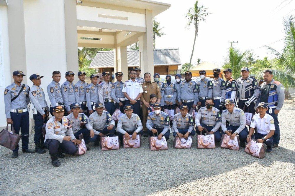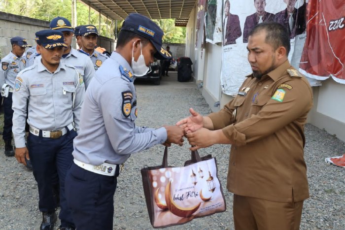 KOTA JANTHO — Penjabat (Pj) Bupati Aceh Besar, Muhammad Iswanto SSTP MM, membagikan bingkisan lebaran untuk 38 personil kontrak Dishub Aceh Besar yang selama ini mengatur lalulintas selama Ramadhan, di Blang Bintang, Senin (17/04.2023)