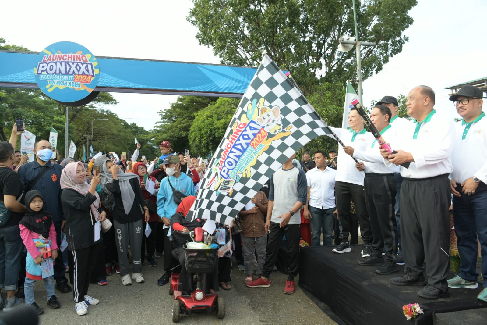 melepas peserta jalan santai untuk memeriahkan dan mempromosikan PON XXI Aceh-Sumut, kepada masyarakat luas. Kegiatan itu berlangsung dalam seremonial peluncuran Po Meurah atau gajah putih sebagai maskot PON XXI Aceh-Sumut, di lapangan Blang Padang, Sabtu (28/1/2023).