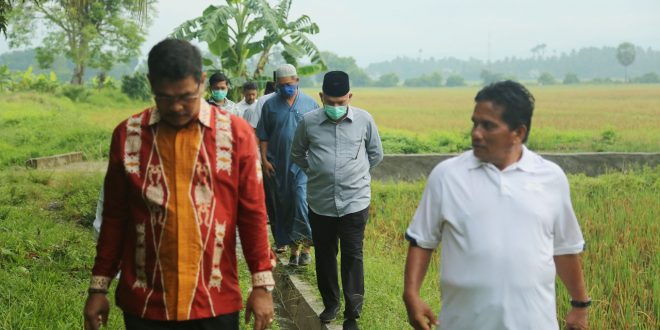 Sekretaris Daerah Aceh,Taqwallah bersama Kadis Pertanian dan Perkebunan, A. Hanan, Kepala DKP, Ilyas, Kepala Dinas Pengairan, Mawardi meninjau irigasi persawahan di Gampong Lubuk, Aceh Besar, Kamis (23/4/2020).