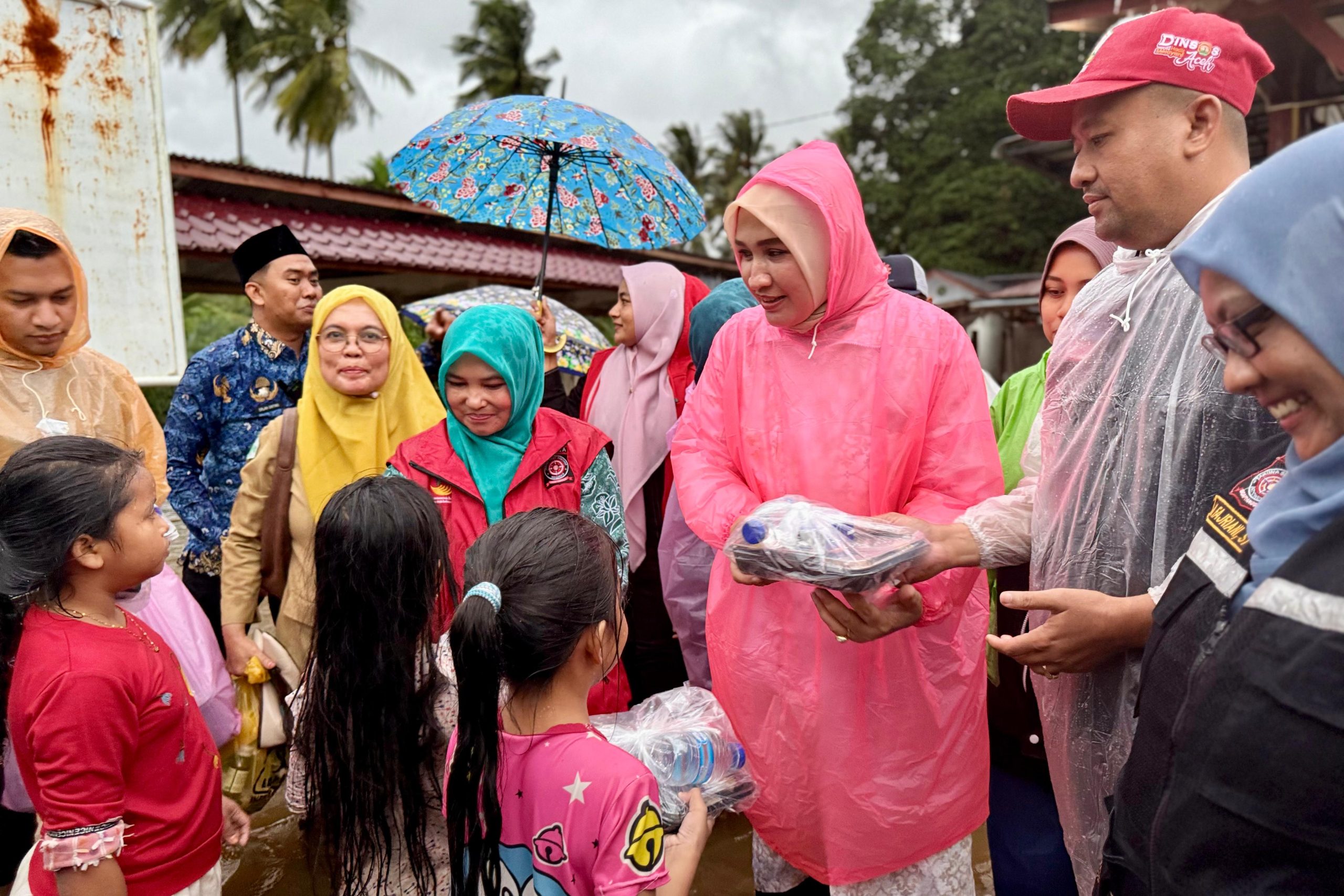Di posko pengungsian Mushalla Matang Kareung, Kak Na bersama Bupati dan Ketua TP PKK Aceh Utara serta Plt Kadinsos Aceh juga menyerahkan bantuan tanggap darurat.